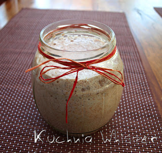 Ciepłe mleko wymieszać z drożdżami, łyżką mąki i cukru. Odstawić rozczyn aż wyrośnie.
